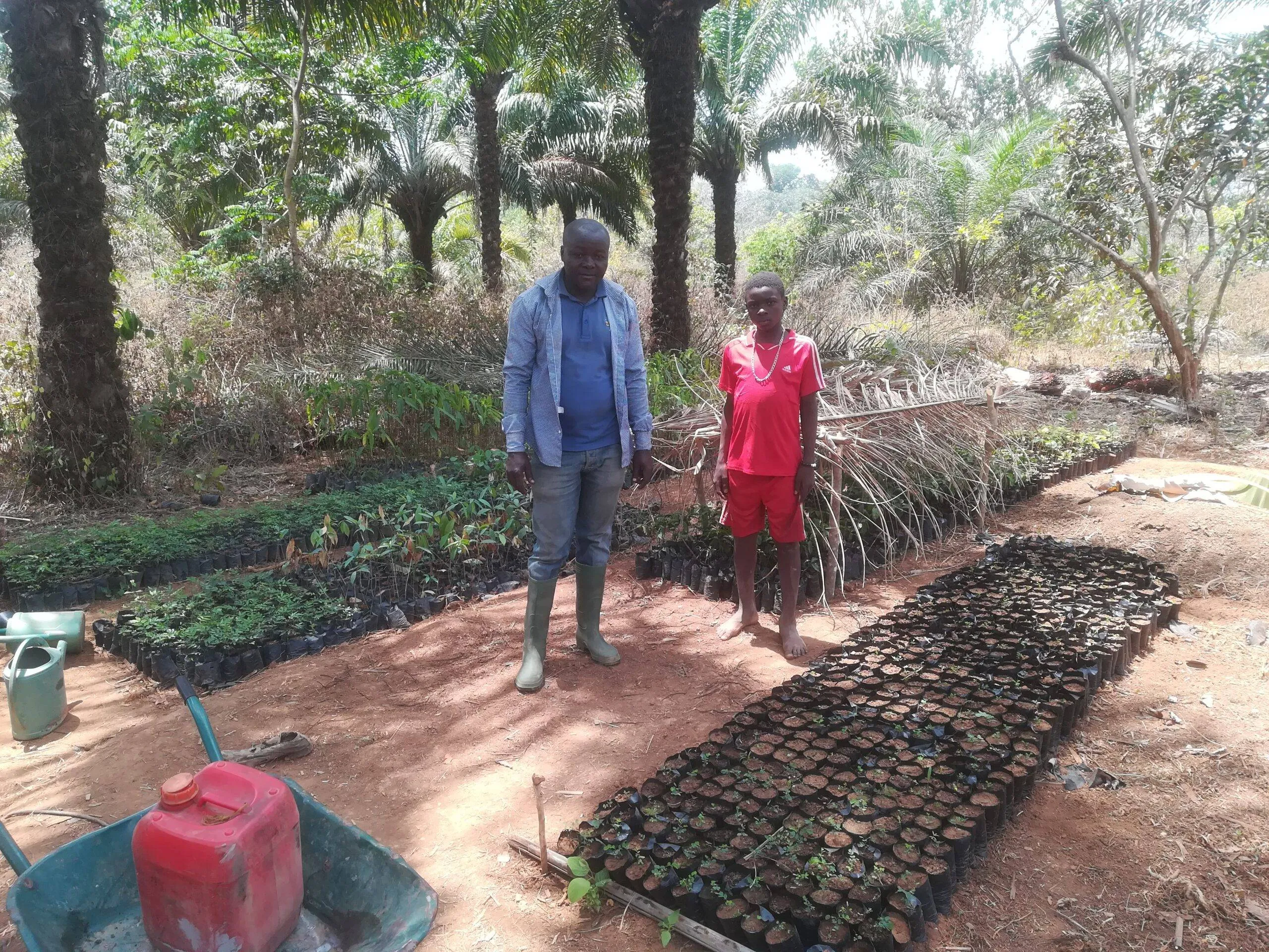 Tree nursery with Limba (Terminalia superba) and Acajou (African mahogany, Khaya grandifolia) seedlings (Maloure; April 29, 2021)