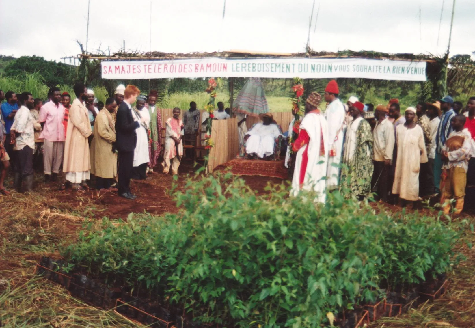 Bamoun Sultan Mbombo Njoya II attends the planting of a final hectare of Eucalyptus near Nkoundja (August 23, 1997)